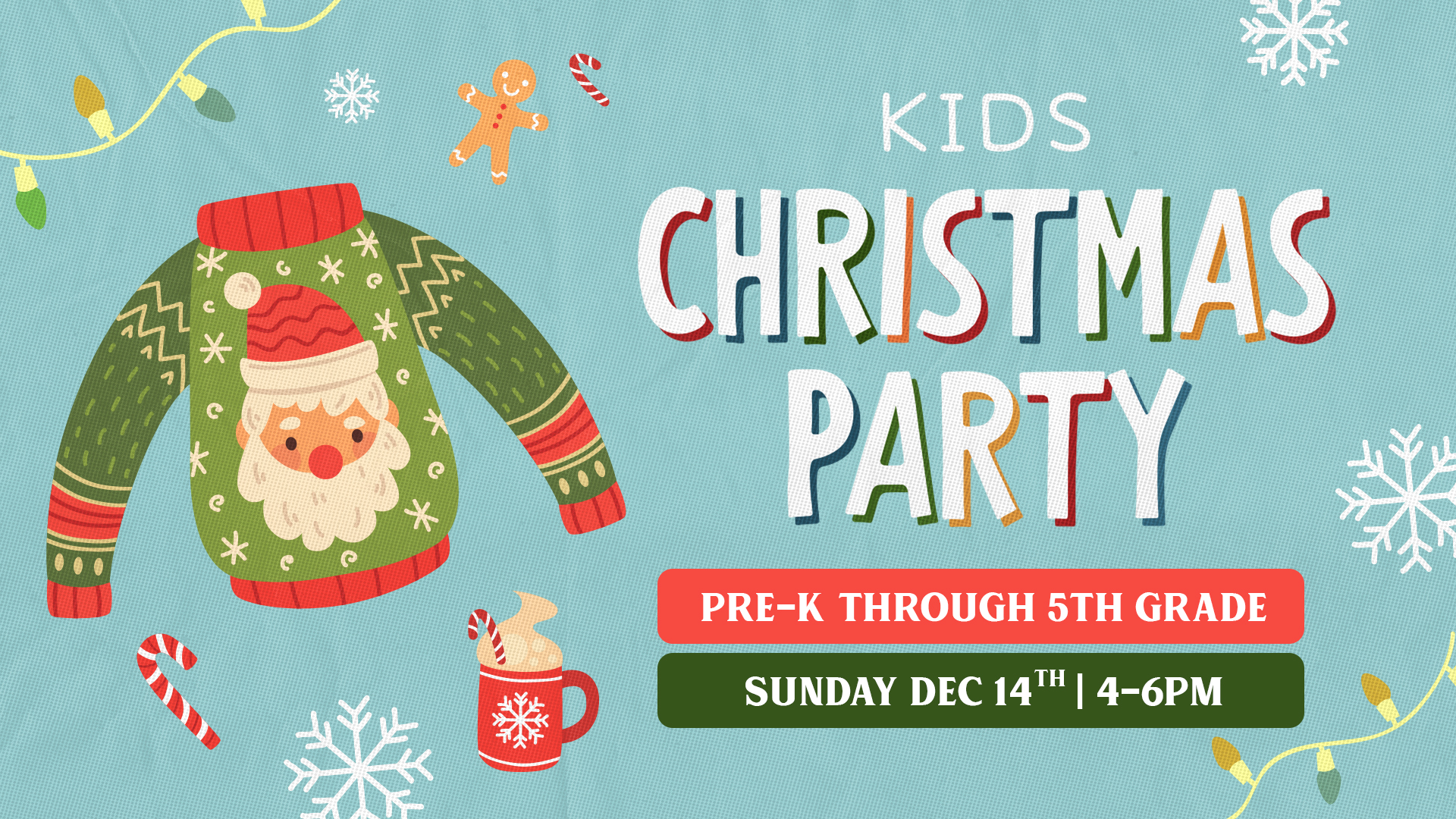 Circle the date and get excited! The Kids Christmas Party is happening Sunday, December 14th, 4–6 PM. More Christmas fun info is coming soon!